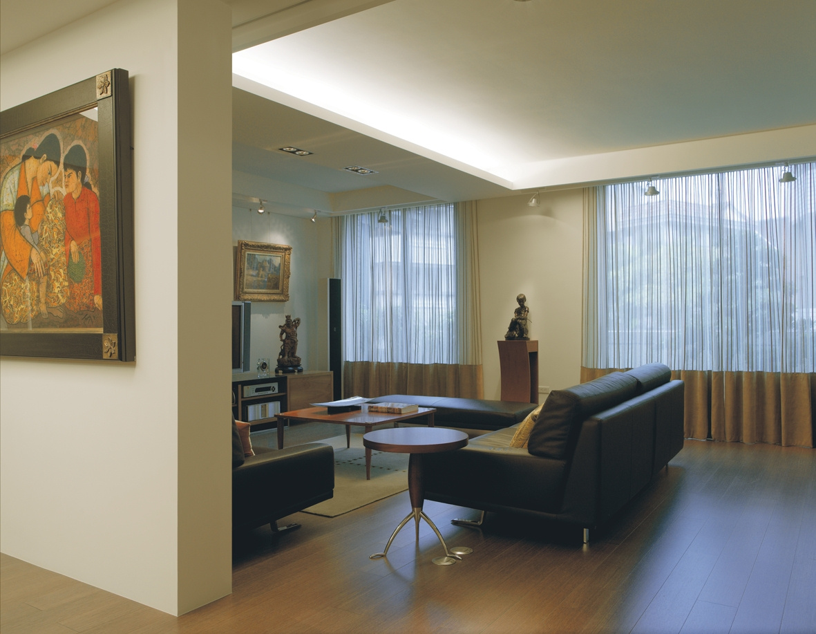 空間滿足擁有各式古董收藏品的屋主的需求,大量牆面留白以供展示,宛若住居在博物館之中。獨立存在訂製而成的可移動式傢俱-包括玄關鞋櫃、電視櫃、廚房工作台、起居室吧台、主臥室衣櫃、衛浴洗手台等等,除結合從舊居中遷移而至的原有傢俱整體設計,因其可移動非固定在絕對的空間之中的特性,深具環保的概念。原本厚重的鋼板樓梯,因漆上白漆再鋪上如地毯般的實木踏階後,輕盈地連接了獨棟三樓的空間。