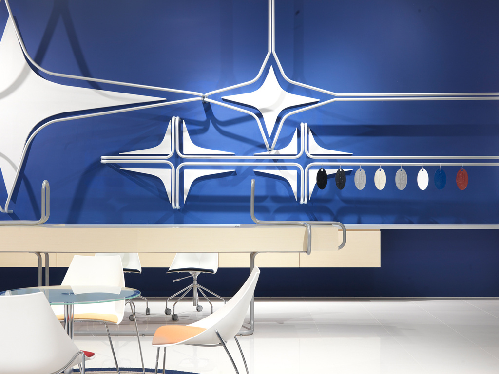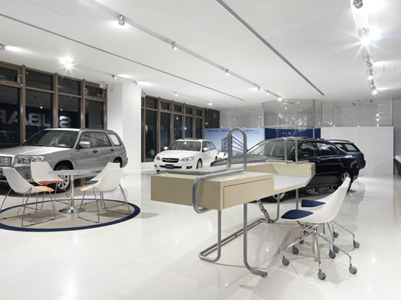 內湖瑞光路速霸陸汽車展售中心 概念:速霸陸座標定位 速霸陸網站上特別強調「水平對臥引擎」所提供的動態平衡,並以座標定位的有限移動來顯示,台灣展售中心的設計概念,就是將速霸陸的標識與座標軸相結合及立體化,引伸為躍動的心電圖,此來呼應「年輕、動感、樂趣」的主題。 業主 台灣意美汽車股份有限公司 地點 臺北 總樓地板面積 238㎡ 材質構造 拋光石英磚,地毯,金屬圓管,強化清玻璃 設計年份 2007 完工年份 2007