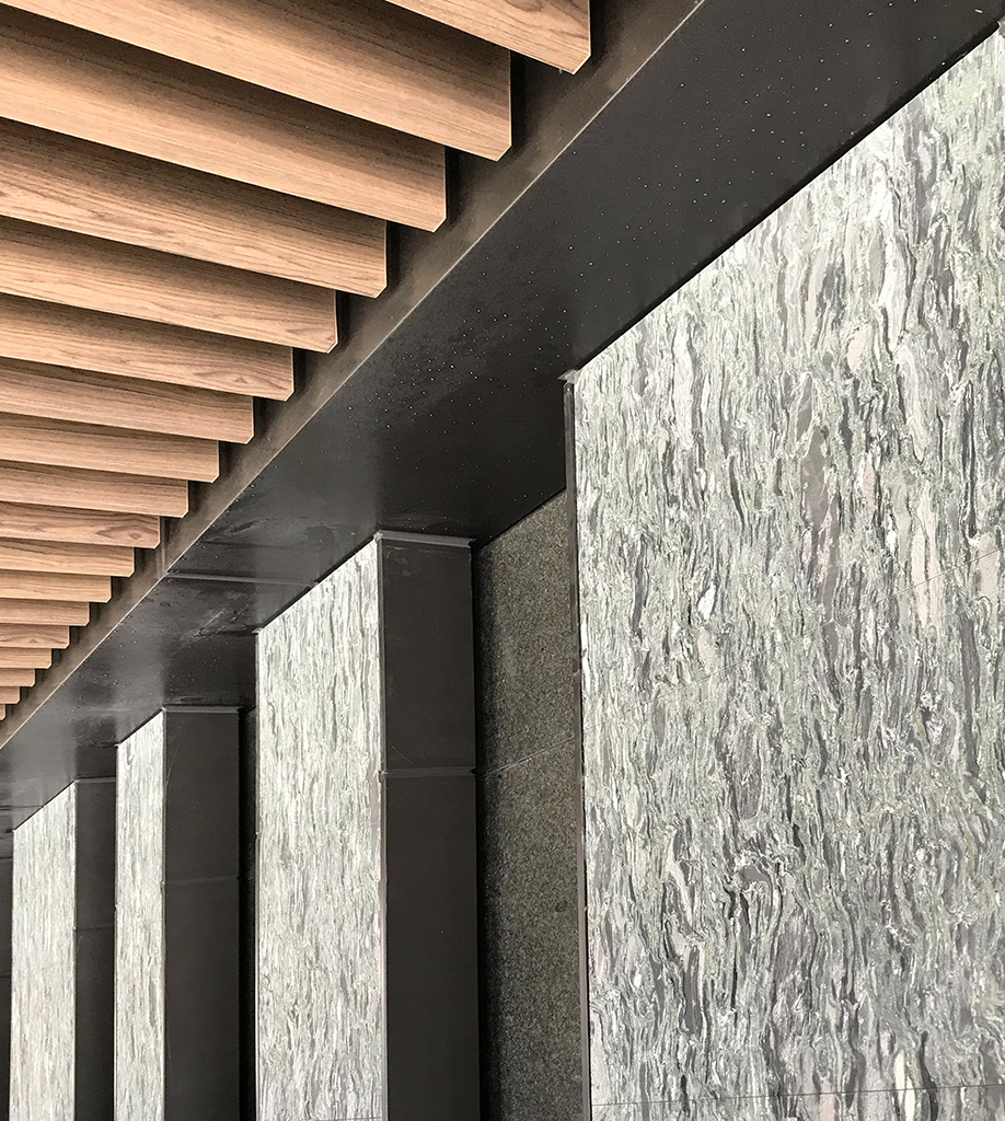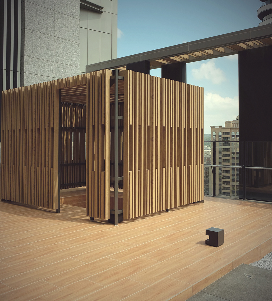 本基地座落在桃園藝文特區, 周邊的規劃都屬於大型開發案, 而本案相較下是一小型建設案. 如何在周遭建物高度將近兩倍的環境下去挑戰它的識別度是我們設計時重要的課題.讓物體有放大的效果在色彩上必須選擇淺色系材質, 因此有個性的西西里金花崗石成為主要的外觀材質. 本設計同時挑戰的是建築物的高度. 為了達到高度的更延伸感,我們認為西方古典建築對假透視的運用是一種參考的手法. 因此低樓層的垂直牆板跨越三樓層,中間樓層跨越兩樓層, 而最高樓層以單層表現. 如此從地面望上去, 樓層的高度被擴大延伸, 產生了假透視的效果. 本案另一特色是其建築物的面向與傳統街屋相同均是以前院及後院為主要的建築物立面, 而兩側距離臨房相對靠近, 不容易被看到 . 我們重新詮釋古典傳統對"facade"(正面)的設計, 並更強調表皮與結構可以因為脫離而創造出自由與跳動的視覺效果. 本設計試圖從古典傳統取材,發掘新的可能性.