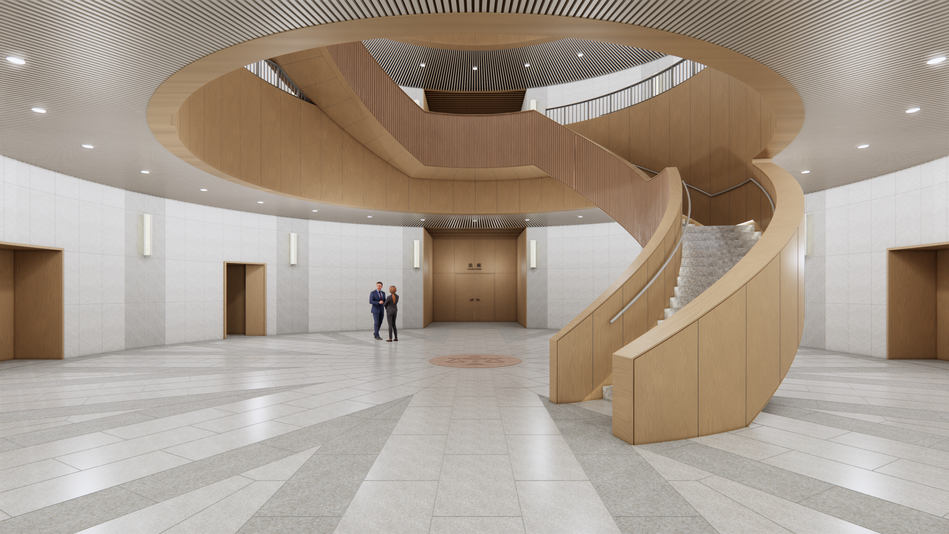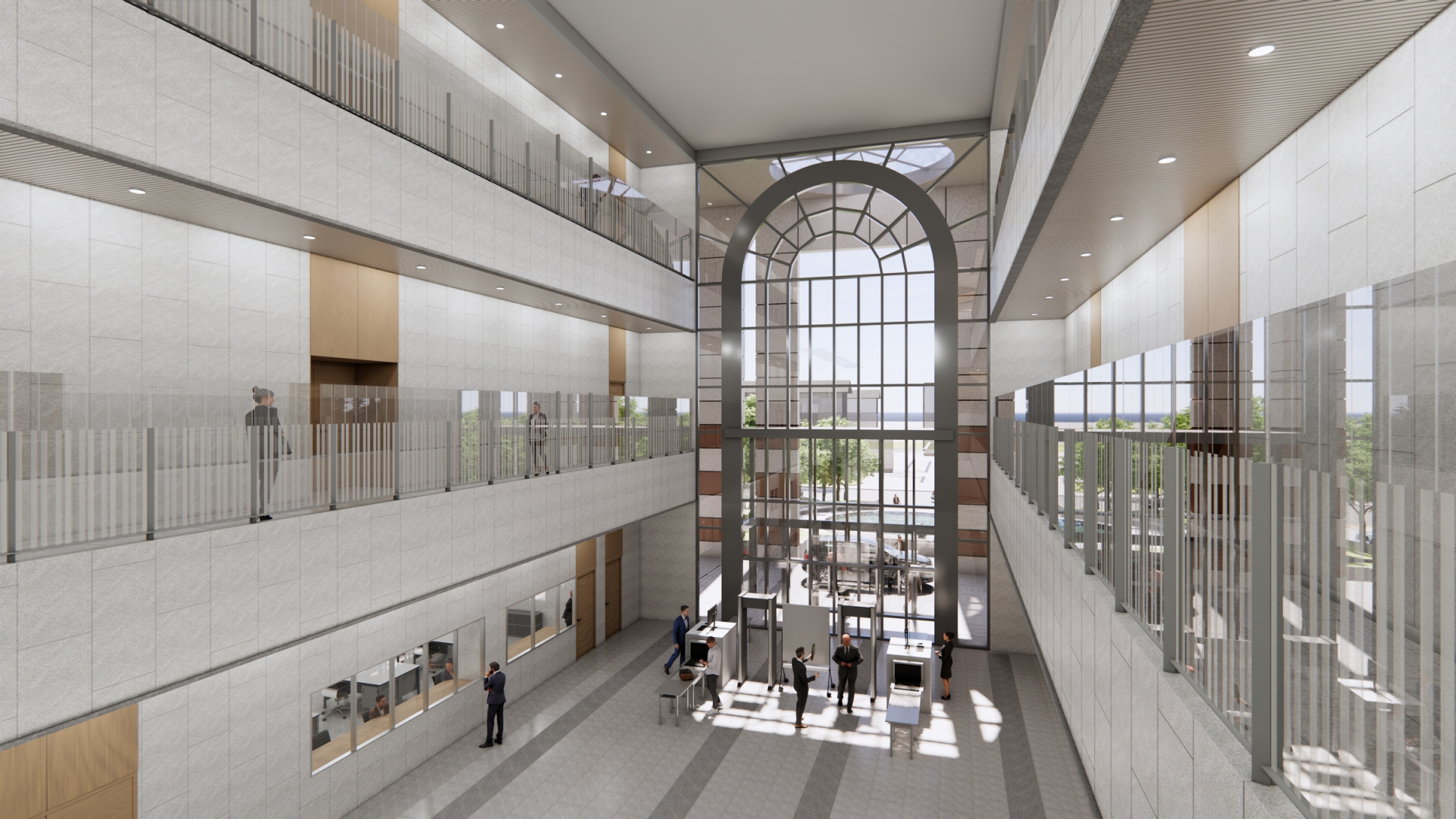 三層樓挑高之入口大廳,為室內引入充足的光線,同時以拱型金屬強調古典元素,不論是洽公民眾或機關內部人員,都能獲得舒適的空間體驗,因本案空間性質及管制用途,分為前棟、後棟,以中央走道連結,亦為垂直動線服務區,並以圓形挑空中庭作為樞紐,為建築物之核心,創造視線及動線之流動性。