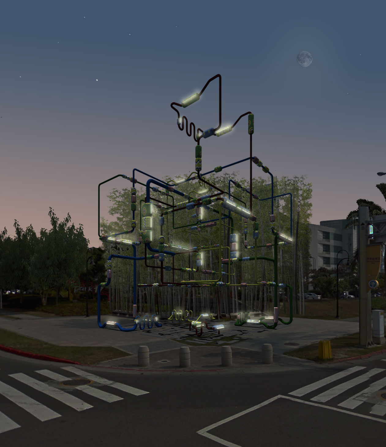 以南科的QR CODE為平面向上投射出立體的串珠,以鋼構骨架及陶串珠,創䢔兼具科技及童玩的效果。