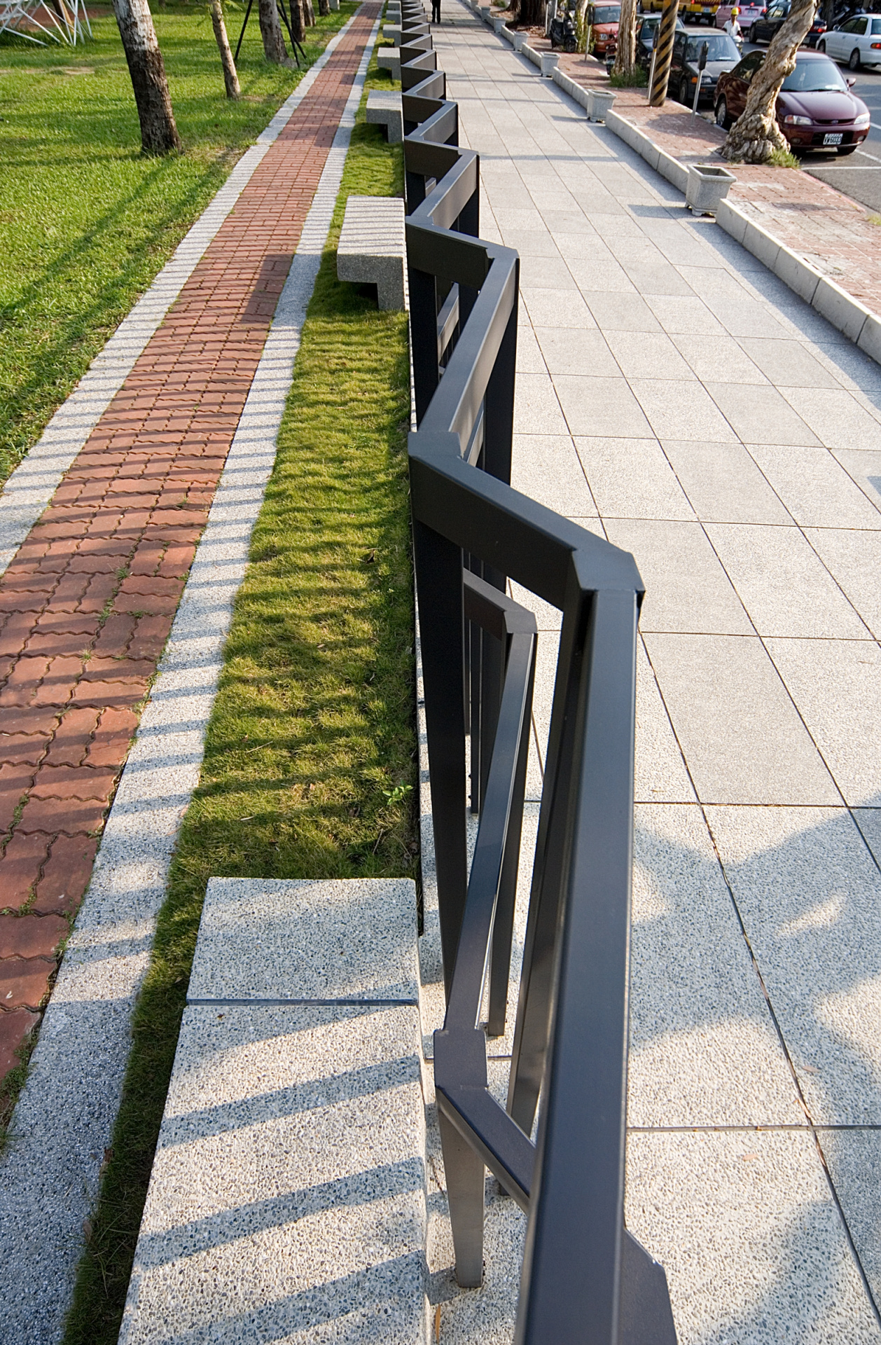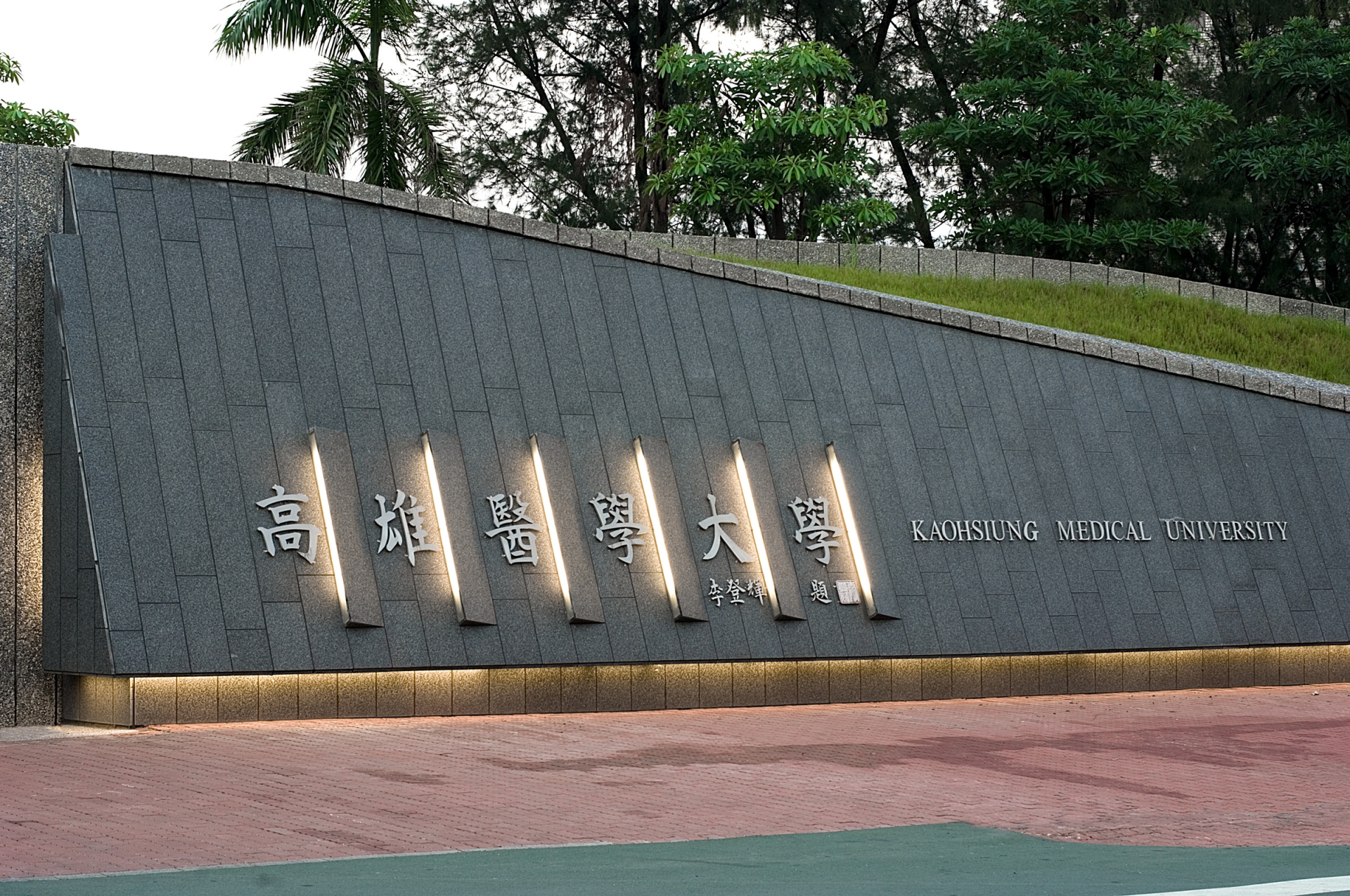 高雄醫學大學同盟路校門 校門為校園內主要軸線「史懷哲大道」的出口與端點,設計擬表現該校以生命科學為職志的特色,以一個地景式的設計由草坡,鋪面,以DNA的雙螺旋形式做為基本圖案,來收納圍牆、入口大門、校名、警衛室等功能,來創造一個極為自然、穿透,卻又有獨特意象的景觀,圍牆雖然只有3米縱深,但是因為進出及高低的組合,而塑造出較實際狀況更深更長的透視感。 業主 高雄醫學大學 地點 高雄 材質構造 RC結構 設計年份 2003 完工年份 2004